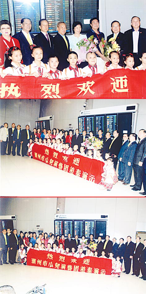 应邀请来泰参加泰国潮安同乡会附属潮安语言学院暨潮安幼儿园两座教学楼十五日举行落成揭幕剪彩礼演出助兴。由广东省潮剧基金会名誉理事长,潮州市传承潮剧艺术中心理事长陈浩文任团长亲率领的「潮州市传承潮剧艺术中心少儿访泰文化交流演艺团」一行近四十位,以本月十三日(星期五)上午十时四十分,乘搭中国南航CZ375班机自汕头抵曼谷素旺那奔机场时,受到潮安同乡会负责演出的诸首长:永远荣誉理事长:张荣炳,张远发,陈绍扬,理事长张建基,副理事长:林自华,李鉴川,黄水金,许金扬,郑暹国,谢辉彬,何 光,邱燕桂,常务秘书:陈松深,黄炳耀,丁长电,常务稽核陆少滨,常务理事兼文教股股长魏俊兴,常务理事兼工商股股长陆耀乐,常务理事兼福利股长陈坤潮,理事:陈旭光,许业武等的热烈欢迎与亲如一家人般的接待。合影后分乘特备大型冷巴进入曼谷市区,位于唐人街耀华力路叻差旺四角,永远荣誉理事长陈绍扬辖下的大华大酒店十楼餐厅同进午餐,然后,少儿团被安排至乡会潮安语言学院宿舍休息下榻。 又:「新加坡潮安会馆庆贺团」也将今天(十四日)抵谷共襄盛举。