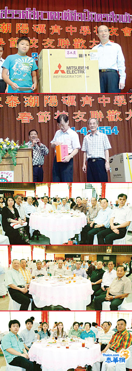 旅泰潮阳砺青中学校友会春节校友联欢大会,于2011年4月24日(星期日)上午10时,假座泰国潮州会馆大礼堂隆重举行,筵开四十多席,参加理事、校友数百人,窗谊情浓,其乐圆融。 大会主席王学厚理事长致词,略谓旅泰潮阳砺青中学校友在此欢聚一堂,共迎新年,叙旧论今,窗谊永笃,实为人生一大乐趣;砺青中学历史悠久,治学有方,桃李满天下,旅泰历届校友人材辈出,名扬暹邦;校友们爱校护会,热心回馈社会,参与公益事业,出钱出力,贡献殊多,促进泰中友好交流,成绩有目共睹;望大家继续保持发扬,推动会务向前发展,顺祝身心康乐,家庭幸福,万事如意! 联欢会上并有歌唱,魔术及抽幸运奖助兴,内容精彩,琳琅满目,老少皆乐,场面温馨,至下午2时多尽兴愉快结束。 兹志该会理事、校友芳名如后:永远名誉理事长李光隆,马君楚,李光龙,马灿坡;名誉理事长萧廷理,王志德,陈焕铭;理事长王学厚;副理事长李永根,李先强,马陈强,方汉标,郑定沛,李绍英,李桂雄,马陈敬,马永定,马灿儒,林荣佳,郑克宣,李灿瑛,郑细芳,郑素芳,周素娟,郑若瑟,马陈峰,郑开泽,张尊千,郑云珍,郑美辉;顾问马陈钦,张朝江,张庆雄,马化道,吴仲昭,吴政孝,徐义胜,彭大立,马永绥,马龙辉,梦莉,郑基创,翁宗达,马秀聪,马钟泰,马福平,马国龙,郑克绍,马文清,马裕麟;常务理事陈运和,张友源,郑澄章,张朝泽,李庚武,张祥君,郑长桂;理事郑定光,黄振荣,刘清辉,李运进,郑妙卿,李佩珊,萧光豪,陈新坤,张国荣,许其江,郑志镐,王惠贞,郑定勃,黄长宏,郑作炯,马灿明,马嘉乐,黄赞兴,陈碧如,陈运民,马陈龙,马陈锋,郑定铎,张朝明,李文洲,马陈杰,李健丰,李镇文,马立诚,郑增利,马灿意,郑作义,郑少奎,马伟坚,萧芝业,李光勇,马岳伟,马克森,陈运寿;总干事李亚川。